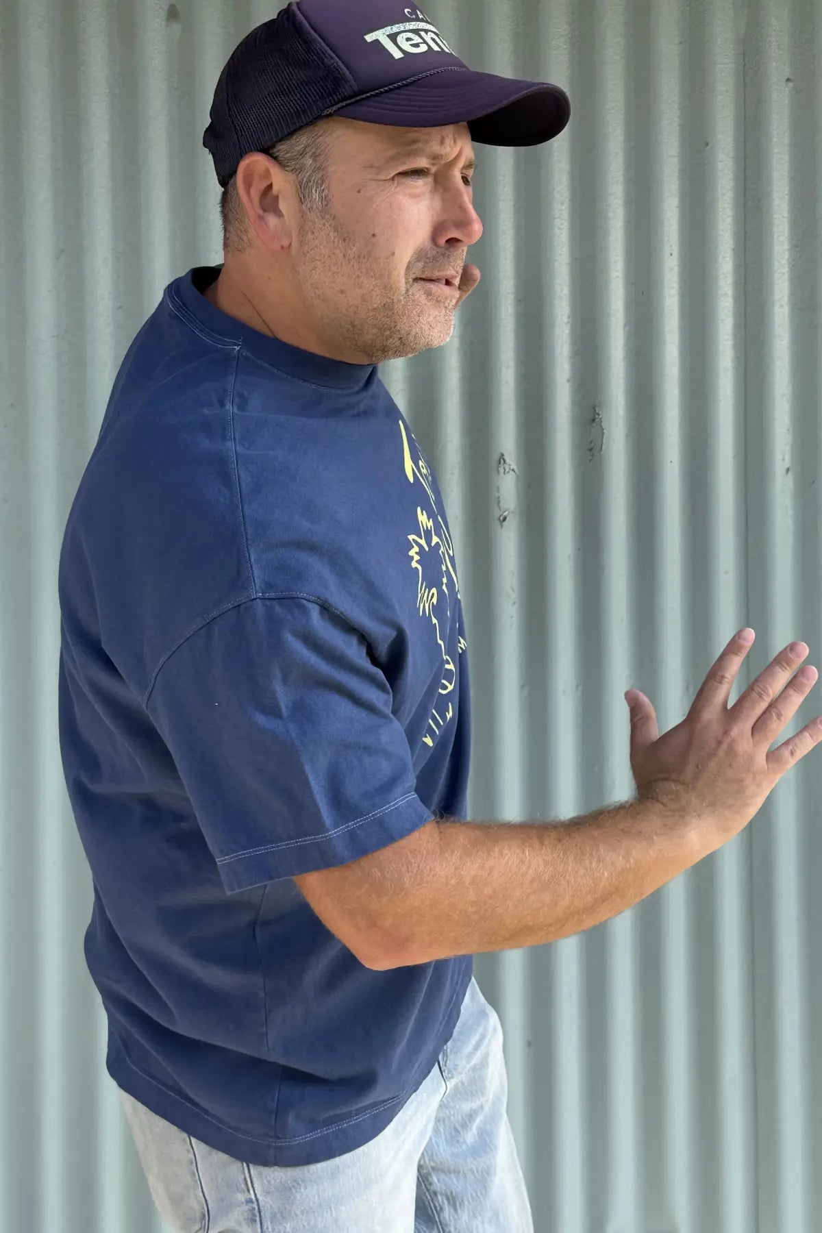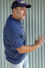 Taking inspiration from some vintage matchbooks and graphics from the Mid-20th Century, we loved how this design and tee turned out. We over-dyed these beefy tees in a navy blue, and screen printed them on some really nice and soft oversized tees. These tees are great to style with jeans or under a button down shirt.