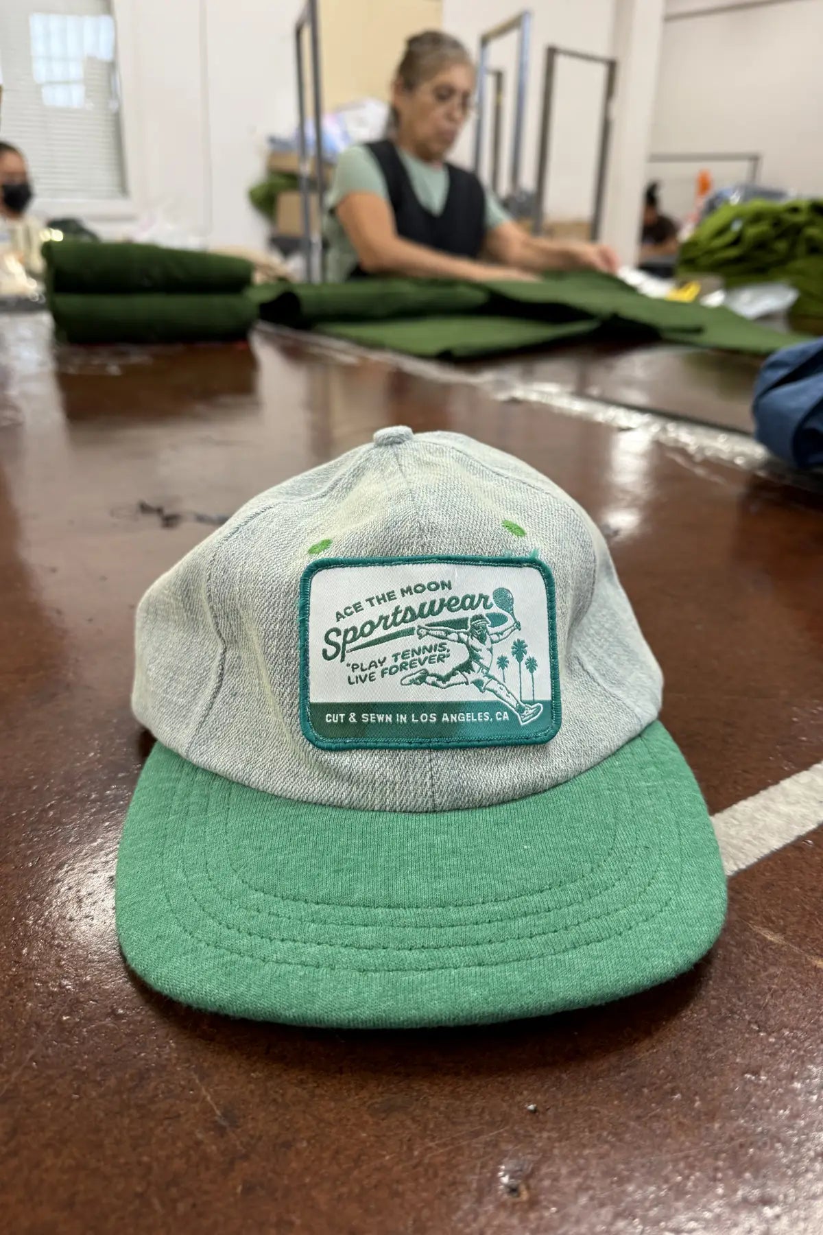 Our first foray into denim! We made these hats from scratch, at a family-owned hat factory in Los Angeles! We professionally washed both the denim and the fleece, giving them a super soft feel. These hats are awesome for that après tennis drink and shopping with your friends.